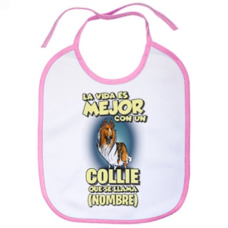 Babero la vida es mejor con un perro raza Collie blanco y marrón que se llama personalizable con nombre