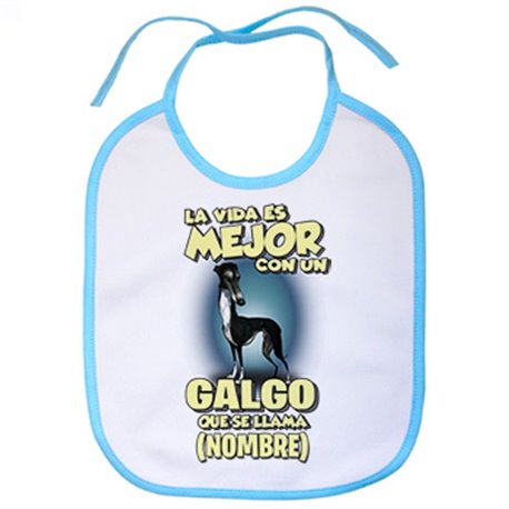 Babero la vida es mejor con un perro raza Galgo negro que se llama personalizable con nombre